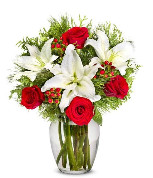Just in time for the season of giving, this beautiful Christmas bouquet will add a festive touch to any room. Delivered fresh from the fields, this arrangement includes fragrant white lilies, red roses, Christmas greenery and hypericum berries. A joyful and merry gift for anyone!
