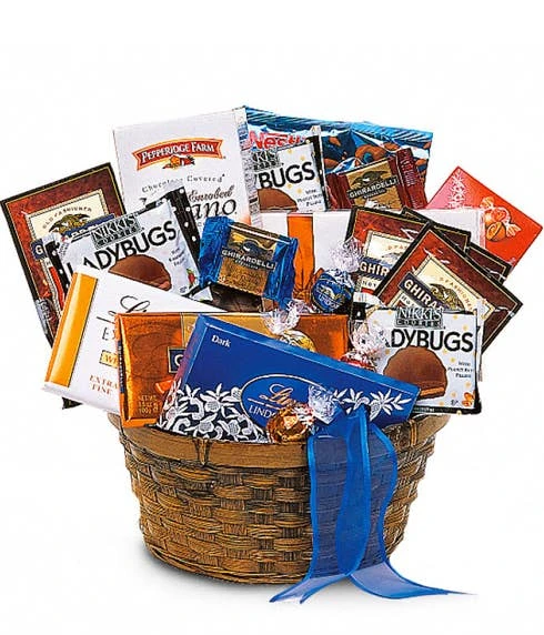 Send a chocolate covered gifts basket and make a sweets lover in your life oh so happy! Sending these sweet delectable baskets full of goodies will fill their tummy and lift their spirit! Your gourmet treat comes in a lovely wrapped display that they can keep after they’ve finished their snacks. The arrangement is finished with a big blue bow for a beautiful presentation that they’ll never forget. This present makes a great happy birthday, or just because gift for someone who loves candy and is special to you!