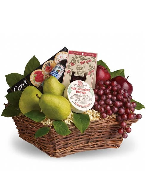 Send an instant pick-me-up with a basket of high end goodies with fruit that’s sure to delight your recipient! This fresh from the garden arrangement holds an assortment of snacks, including pears, apples, grapes, cracker and cheeses, dried cranberries, and sausages! These affordable gourmet gift baskets are the perfect way to extend your thank you, congratulations, sympathy, get well, and other warm wishes. Sending gifts as soon as today or tomorrow is easy.