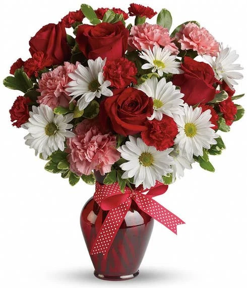 Send flowers in a blossoming expression of your sweet sentiments with the hugs and kisses rose bouquet! Perfect for a significant other, mother, or anyone else, this beautiful arrangement is a symbolic presentation of your love in a gorgeous red and white flower centerpiece. Sweet light carnations, deep crimson roses and miniature carnation blooms mix with daisies and lush greens in a romantic vase. As if to say I love you in stunning floral style, it would make anyone gasp. This style is great as a Mother’s Day bouquet too.