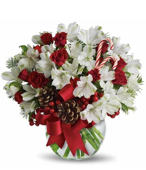 Let it snow! Let it snow! As the snow falls this holiday season, send well wishes to loved ones with this Christmas themed bouquet. Arranged by a local florist and adorned with sweet candy, sending this winter centerpiece will surprise and delight someone in the best way possible! Each one is hand delivered and features beautiful alstroemerias with berry, candies, and rose stems. The design is housed inside a slightly rounded bubble bowl. Finished with pine cones, this floral arrangement brings the warmth of this beloved time of year indoors to your favorite space, whether at work or home.