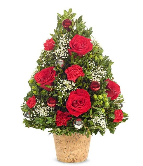 A fresh, festive, fragrant mini Christmas tree is the perfect present for a loved one or friend this holiday! This stunning evergreen arrangement is shaped like the classic Christmas tree and decorated with red roses, mini carnations, fresh berries, white gypsophilia and sparkling ornaments. Send some love in a keepsake planter today from a preferred local florist!