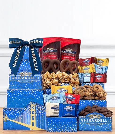 This delightfully delectable gourmet chocolate tower consists entirely of classic Ghirardelli chocolates, a favorite in the U.S. since their humble beginnings in 1852. This sophisticated four-tier tower is stuffed with a variety of scrumptious chocolate squares, crunchy caramel corn, and crispy wafers and cookies. A generous and thoughtful way to wish your favorite sweet-toothed friend or loved one a congratulations or happy birthday!