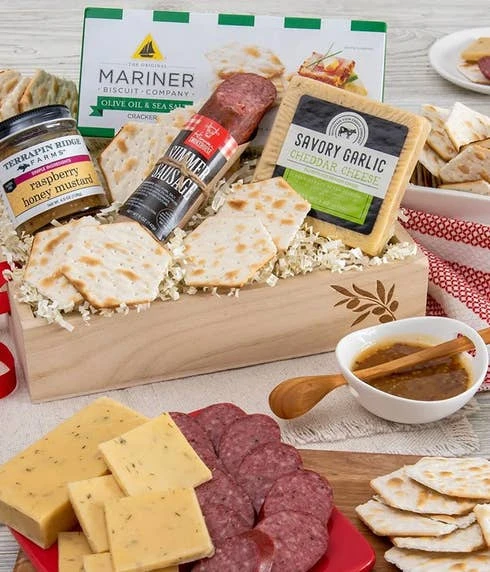 This luxury spread of sausage, cheese, crackers and jam is perfect for a summer picnic, cozy winter night indoors, or just about any time! This tasteful gift is sure to delight friends, family or clients. Or you can surprise your loved one with these signature flavors next to a crackling fire, the possibilities are endless!