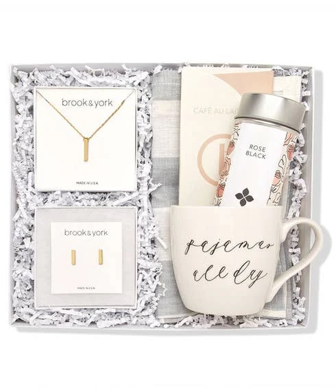 This classically elegant gift box includes everything you need to feel at peace in your home. Composed with a timeless gold necklace and earring set, as well as some soothing tea and accessories, this gift box is the perfect, personalized and modern gift. Made exclusively with American Made or Women-Led brands.