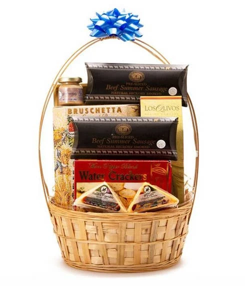 Savory and delicious, this fabulous mixed snack gifts basket delivery is filled to the brim with tasty treats! Sending it will definitely leave a lasting impression. Perfect for just about any occasion there is, our savory baskets are presented elegantly arranged with delicious foods with meat, cheese, cracker, jam and sweet treat selections! Please note, that the variety of gourmet items may vary. Send this affordable and tasty arrangement and sit back to wait for the thank you call.