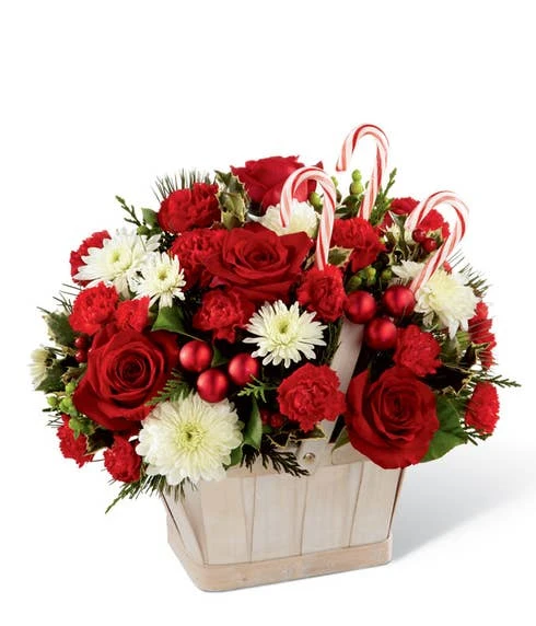 Take a trip down candy cane lane with the Peppermint Delight Holiday Bouquet! This striking mixed arrangement is a fun and joyful way to celebrate the holiday season. Charming red roses and mini carnations are beautifully arranged with brilliant white chrysanthemums and lush holiday greens. 3 candle canes offer the finishing touch to this remarkable bouquet. Make your recipient’s day with a bright seasonal arrangement.