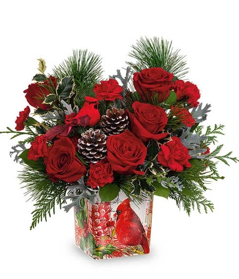 A bouquet that captures the beauty of the Cardinal in the Winter. Red roses and carnations with pops of greenery and extra details not unlike what you may see on a Christmas tree farm. Send some extra holiday beauty and cheer to your loved ones this season.